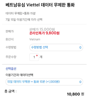 다만, 유심스토어에 있는 대부분의 베트남 심카드가 최대 15일까지만 옵션이 있어서, 15일 이상 베트남에 머무를 계획이신 분들은 선택 가능한 옵션이 많지는 않습니다. 그래도 30일까지 사용 가능한 심카드가 있기는 합니다.