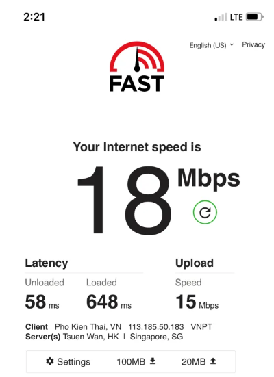 다낭 숙소 건물 2층에 있는 야외 테라스에서 fast.com으로 속도 테스트를 해보았습니다.