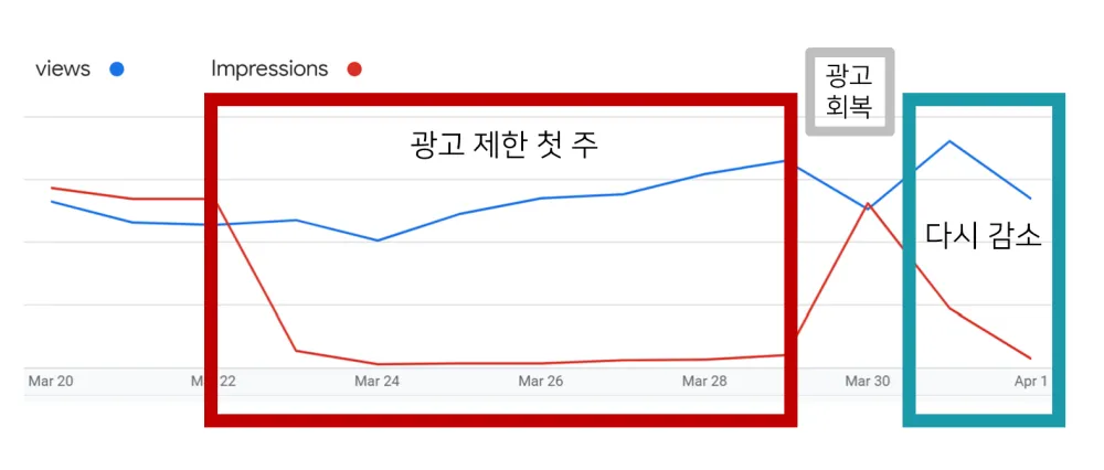 광고 제한기간 방문자 유입과 광고 노출 추이