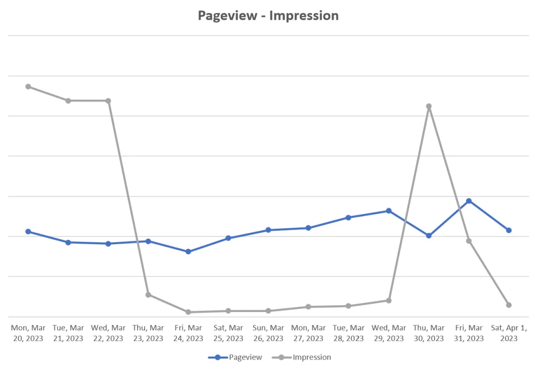 광고 제한이 시작되자 페이지뷰와 별개로 광고노출이 급격히 줄어드는 것을 확인할 수 있습니다. 저는 최대한 빨리 제한을 풀어보고자 더 열심히 유입유치(?)를 위해 글도 쓰고 다른 블로그 방문도 늘렸는데, 그래서인 딱 일주일이 지나자 광고가 다시 회복되기 시작했습니다. (아직 제한이 해제되지는 않았음) 그래서 안도하던 찰나, 왜인지 또 광고가 안뜨길래 보니 광고 노출이 다시 급격히 줄어들고 있었습니다.