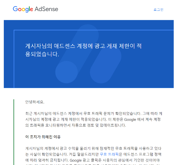구글의 주 수입이 광고수입인 만큼 광고 관리에 신경을 많이 쓸텐데, 광고제한은 서비스 품질유지를 위한 규제라고 할 수 있겠습니다. 블로그에 광고를 붙이면 누구나 생각해보겠지만, 내가 광고를 눌러서 수익이 나버리면 구글 광고 서비스는 돈만 새고 효과는 별로 없는게 되고, 그렇게 되면 구글이 흔들리겠죠. 이런식으로 인위적인 유입 또는 클릭을 "무효 트래픽"이라고 부릅니다.