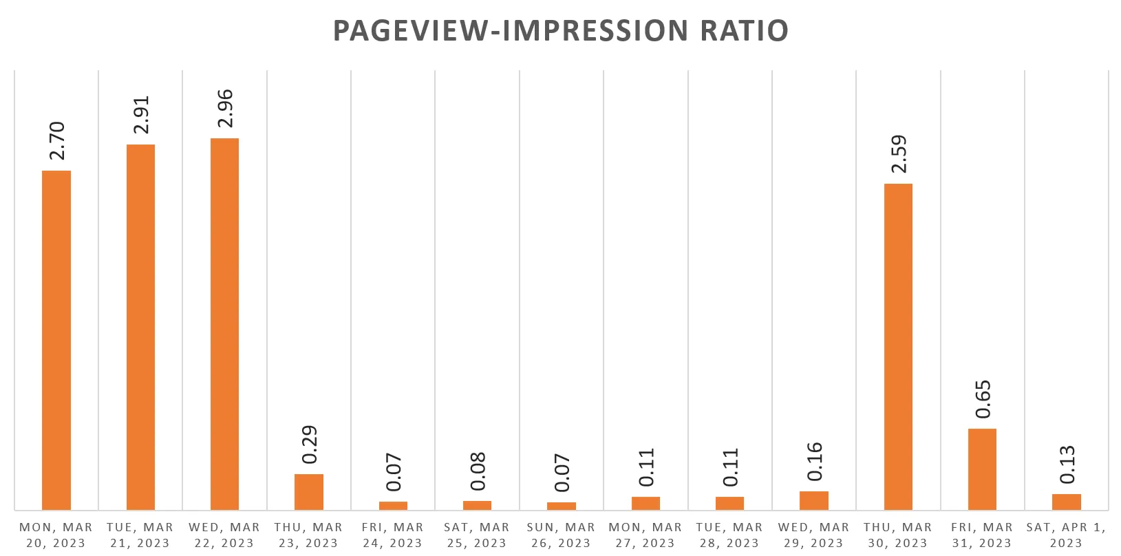 엑셀에서 [광고 노출수/페이지뷰]를 날짜별로 계산하여 다시 표를 그려 각 날짜에서의 비율을 보니 아래와 같았습니다.