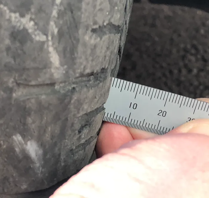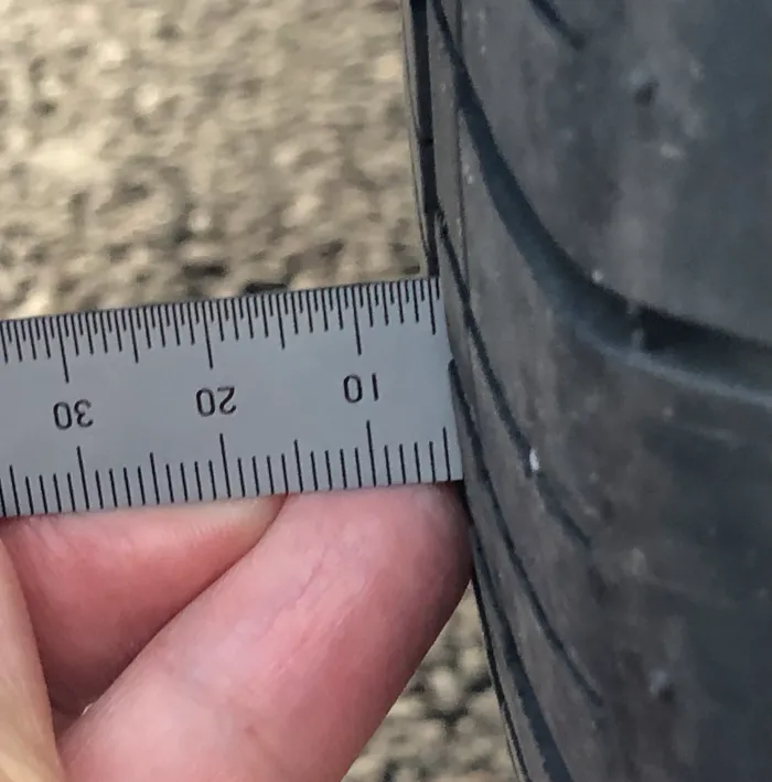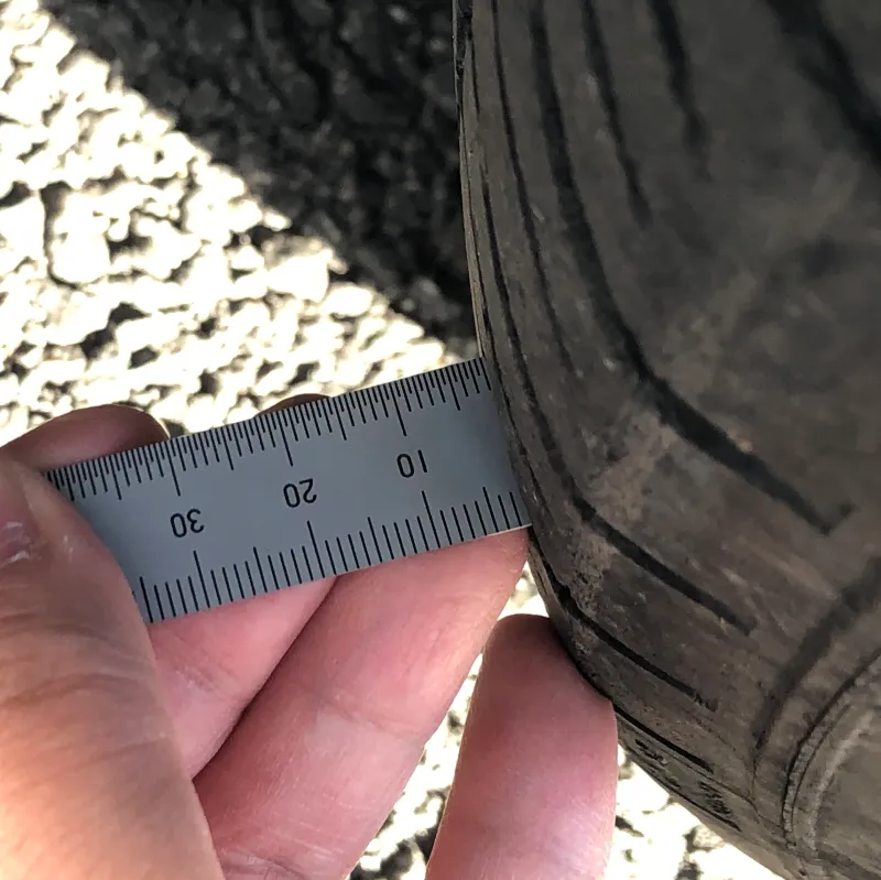 찾아보니 백원짜리를 틈에 넣어 장군님 감투가 얼마나 보이는지로 마모 정도를 쉽게 볼 수 있다고 하여 급히 백원짜리 동전을 구해 앞바퀴 타이어에 넣어보니 아뿔싸.. 감투가 거의 다 보입니다.
