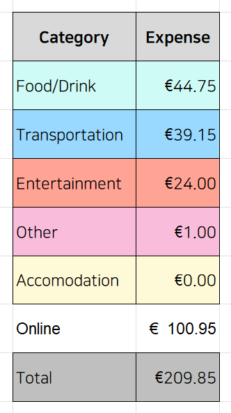 바르셀로나는 3박 4일 일정으로 갔었고, 총 비용은 약 210 유로로 기록되었습니다.