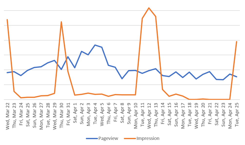 애드센스 리포트에서는 보기좋게 그려는 주지만 여러 데이터를 같은 축에서 보여주는 기능은 제공하지 않아서, 데이터를 엑셀로 옮겨 페이지뷰와 광고노출수를 비교해보았습니다.