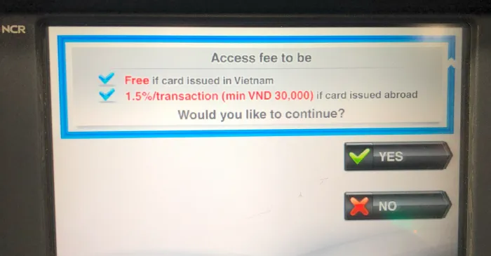 마지막 남은 수수료가 바로 현지에서 ATM 운영주체가 부과하는 [현지 수수료] 입니다. 현지 은행에서 부과하는 수수료기 때문에 한국 쪽에서 면제해 주기 어려운 수수료인데, 이 수수료가 은행마다 다른 경우가 많습니다. 즉, 같은 날 같은 도시에서 인출을 해도 어느 ATM을 사용하는가에 따라 수수료가 다르다는 것이니, 가장 유리한 ATM을 이용하는 것이 좋겠습니다. 최근에는 베트남에서 한국 카드 사용자에게 수수료를 부과하지 않는 은행이 있어 함께 소개해 드리도록 하겠습니다.
