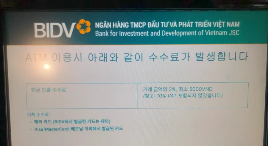 나름 한국어도 지원을 하는데, 수수료를 보면 최소 5,000동 부터 인출금액의 3%를 부과면서 10% 세금도 또 붙습니다. 즉, 100만 동(약 55,000원) 인출 시 3%인 30,000동 + 세금 3,000동으로 총 33,000동(약 2,000원)이 수수료가 됩니다. 보통 이보다는 많이 인출하니, 300만 동(약 16.5만 원)으로 계산해 보면 수수료로 99,000동(약 6,000원)이 부과됩니다. 아래에서 비교해 볼 다른 ATM에 비해 많이 비싼 편입니다.