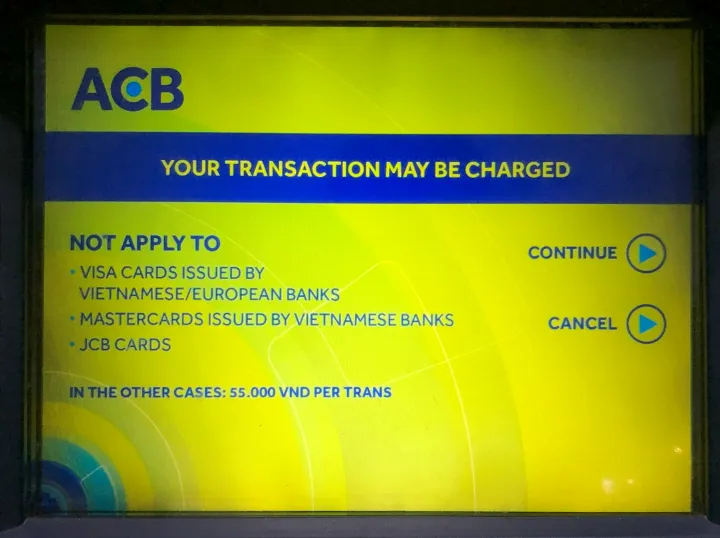 나머지 ATM 중 가장 흔한 이용 수수료는 5만 동 대 (약 3,000원) 정도입니다. 호치민에서는 ACB와 VIB, 그리고 HSBC ATM이 시내에서 많이 보이는 ATM 중 이 정도의 수수료를 부과하고 있습니다. 참고로, 신한은행 ATM 역시 50,000동의 수수료를 부과하는데, ATM이 많이 않아 쉽게 찾기는 어렵습니다.