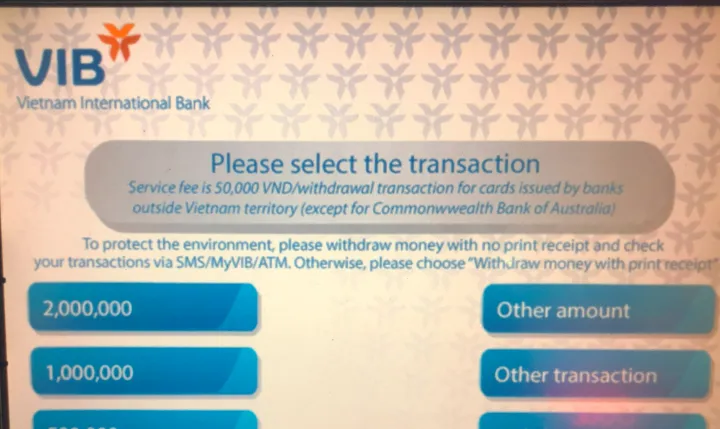 BIDV 외에는 인출 금액에 비례해서 수수료를 받는 ATM은 거의 없는데, 호치민 시티에 본사를 둔 Sacombank ATM은 그렇습니다. 수수료 산정은 BIDV와 동일한데, 수수료 비율이 BIDV 보다는 많이 낮습니다.