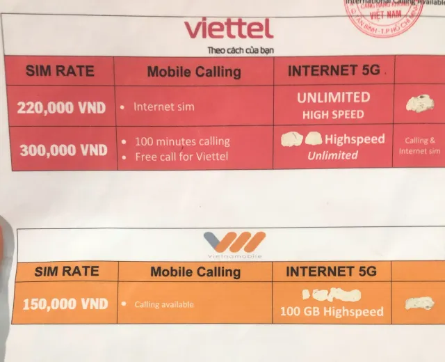 여러 매장 중 한곳에서 보여준 가격표 입니다. 일반적으로는 Viettel이 제일 비싼데, 특이하게 이곳은 Viettel이 가장 저렴했습니다. 여러 통화로 가격이 적혀 있는데, 기본적으로는 베트남 동을 기준으로 하고, 원화나 달러를 낸다면 받게 생기긴 했습니다. 원화를 받더라고 베트남 통화가 더 저렴한 것으로 보이고, 신용카드도 받으니 트래블로그로 금액을 맞춰 환전해 두고 카드를 찍으면 수수료도 없이 손쉽게 구매 가능합니다.