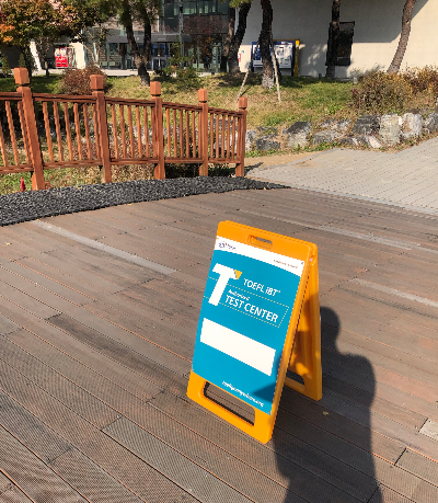 본관인 백년관 2층에 시험장이 있습니다. 건물 정문 쪽에 토플 간판 하나만 달랑 있는데, 이건 아무런 도움이 되지 않네요.