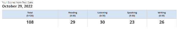 리딩/리스닝이 상당히 잘 나와서 기대를 했는데, 나머지 두개가 기대보다는 덜 나와서 결국 110의 문턱은 넘지 못했습니다만, 10일 준비하고 본 걸 생각하면 나쁘지는 않은 것이라고 합리화 중 입니다.